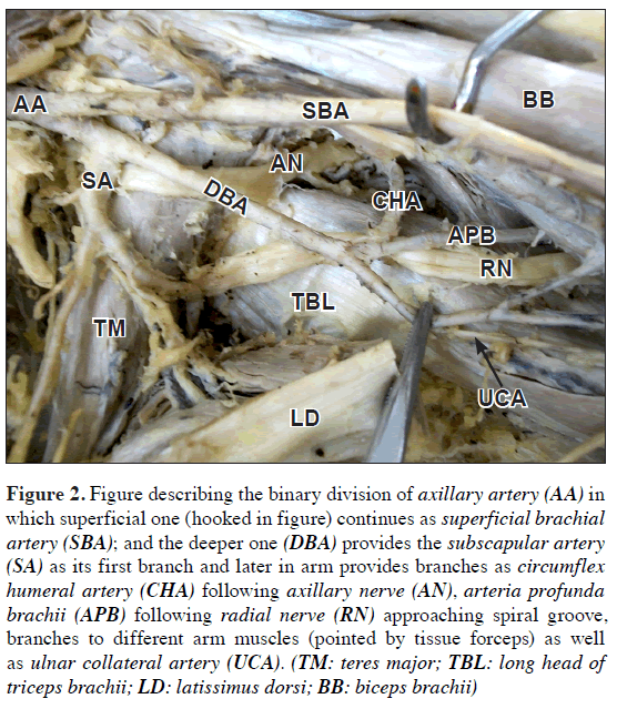 Figure 2: Figure describing the binary division of axillary artery (AA) in which superficial one (hooked in figure) continues as superficial brachial artery (SBA); and the deeper one (DBA) provides the subscapular artery (SA) as its first branch and later in arm provides branches as circumflex humeral artery (CHA) following axillary nerve (AN), arteria profunda brachii (APB) following radial nerve (RN) approaching spiral groove, branches to different arm muscles (pointed by tissue forceps) as well as ulnar collateral artery (UCA). (TM: teres major; TBL: long head of triceps brachii; LD: latissimus dorsi; BB: biceps brachii)