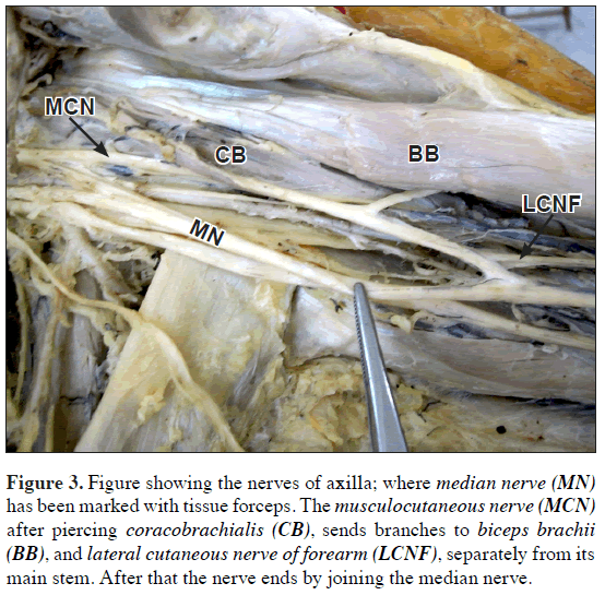 Figure 3: Figure showing the nerves of axilla; where median nerve (MN) has been marked with tissue forceps. The musculocutaneous nerve (MCN) after piercing coracobrachialis (CB), sends branches to biceps brachii (BB), and lateral cutaneous nerve of forearm (LCNF), separately from its main stem. After that the nerve ends by joining the median nerve.