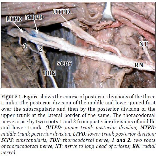 Figure 1: Figure shows the course of posterior divisions of the three trunks. The posterior division of the middle and lower joined first over the subscapularis and then by the posterior division of the upper trunk at the lateral border of the same. The thoracodorsal nerve arose by two roots 1 and 2 from posterior divisions of middle and lower trunk. (UTPD: upper trunk posterior division; MTPD: middle trunk posterior division; LTPD: lower trunk posterior division; SCPS: subscapularis; TDN: thoracodorsal nerve; 1 and 2: two roots of thoracodorsal nerve; NT: nerve to long head of triceps; RN: radial nerve)