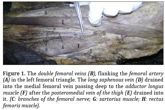 Figure 1: The double femoral veins (B), flanking the femoral artery (A) in the left femoral triangle. The long saphenous vein (D) drained into the medial femoral vein passing deep to the adductor longus muscle (F) after the posteromedial vein of the thigh (E) drained into it. (C: branches of the femoral nerve; G: sartorius muscle; H: rectus femoris muscle).