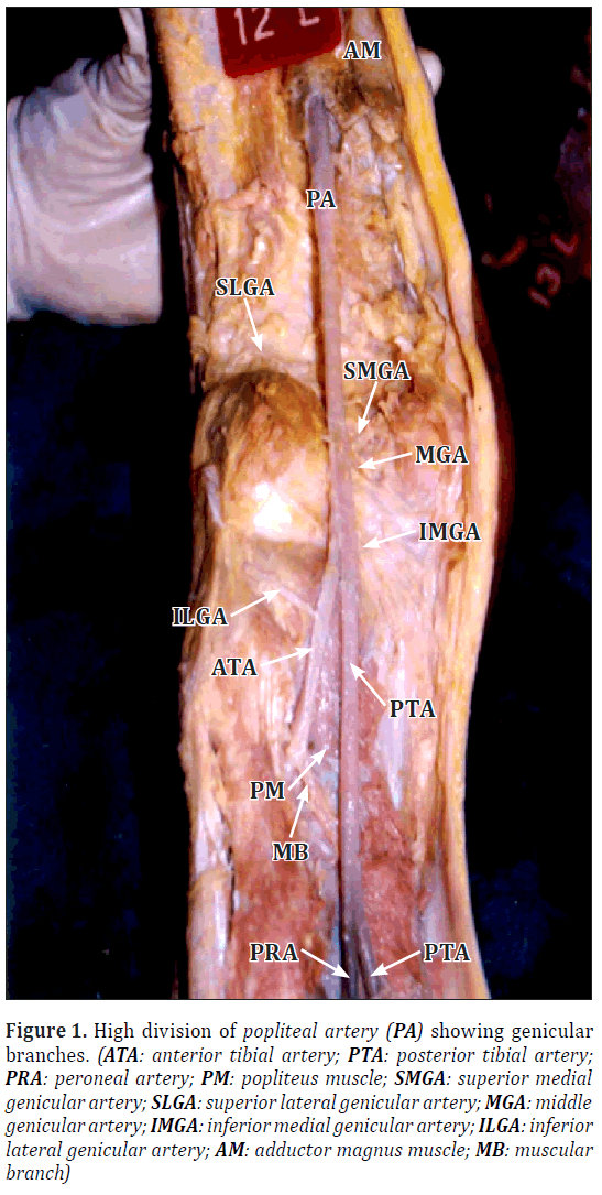 Somayaji et al. dissected 250 limbs. In 25 specimens, high division of popliteal artery was seen. In 19 out of 25 specimens, popliteal artery divided at the upper border of popliteus muscle into an anterior tibial and posterior tibial arteries. In 6 specimens, popliteal artery divided at upper border of popliteus muscle into anterior tibial artery and peroneal artery, where the posterior tibial artery was absent [3].