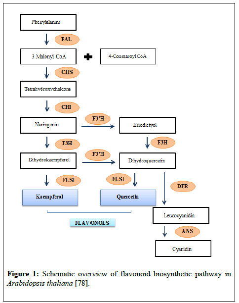 They have been reported beneficial for human health and play a significant role in minimizing effects of various diseases [1]. There are approximately 4000 varieties of the flavonoid compound group that have been identified. Flavonoids are known to be potent metal cheltors and antioxidants. This makes them beneficial chemical compounds that impart various health benefits. Some flavonoids such as the isoflavan called ‘glabridin’, found in Glycyrrhiza glabra, are involved in inhibition of LDL oxidation by scavenging free radicals. Similarly, it has been reported in many studies that flavonoids present in black and green tea are employed for treatment and prevention of cardiovascular diseases [2]. Flavonoids belong to a group of secondary metabolites that are pharmacologically active compounds with roles in plant defence mechanisms [3]. One of the important properties of flavonoids is their low solubility in water which makes them good potential cadidates for drug production. For example aglycones are less soluble in water, so after comsunption they remain in the intestine for less amount of time and have low rate of absorption, thus protenting human body from toxic effects of eating flavonoid rich food [4]. Flavonoids also increase bile discharge, reduce blood cholesterol and lipid levels; and exhibit antimicrobial role against few strains of microorganisms, for example, Staphylococcus aureus [5]. In general, secondary metabolites present in plants are utilized for developmental processes such as photosynthesis etc. These secondary metabolites resulting from phenylalanine and acetyl CoA have roles in plant reproduction, development, and survival [6]. Biosynthesis of flavonoids (Figure 1) starts with production of naringenin chalcone, by condensation of three malonyl-CoA molecules and one p-coumaroyl-CoA molecule in the presence of chalcone synthase (CHS) [7].